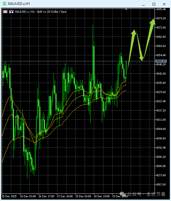上周随着美国通胀数据落地,整体稳健下行的通胀给美联储进一步降息铺平了道路,虽然因为政府停摆,这个通胀数据的公信力稍微有些减弱,但是毕竟也是衡量市场的重要指标,同时初请失业金人数稳步下降,说明就业市场也具备韧性,叠加白银的强势带动,以及地缘政治的不确定性,经过市场发酵消化,黄金也是再度迎来强势上涨,虽然目前还未跟白银一样刷新历史记录,但是也仅仅一步之遥了,技术面上看上周黄金走势焦灼,连续在高位报收十字星,最终选择向上突破,上周四冲高4374一线之后快速回落回踩在4308附近形成日线双底并且拉出十字星,周五晚间冲高4356附近也是迅速回踩4335附近支撑,然后早间开盘直接拉高目前最高触及4372一线,距离前高一步之遥,历史高点4381也是只差一哆嗦,整体偏强格局运行,但是需要谨慎本周圣诞节,不排除有高位的获利回吐走势,所以不盲目追涨即可,日内重点关注4335周五晚间冲高回踩的低点支撑。