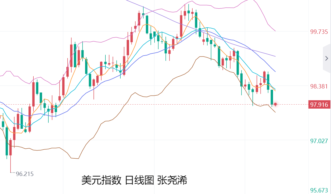 短期来看,美元指数布林带偏向开口向下,前景偏弱,后市将继续走低回落,而继续支持金价反弹,因而,短期操作上,金价仍偏向看涨为主。