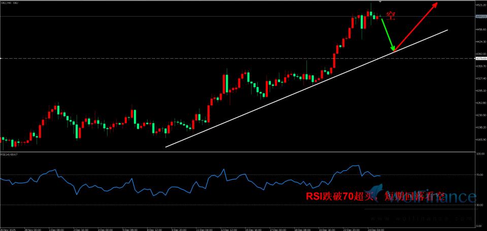 昨日周三,国际黄金震荡十字收线,有反弹见顶看空的预期,其走势在突破4500美元关键关口,创下4525.42美元的历史新高后,随后在圣诞假期前获利了结回吐涨幅,未能持稳;这位短期走势增添了见顶回调的预期;