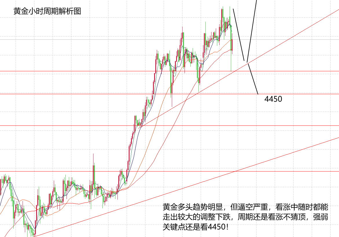 本周市场的基本看法和交易原则保持不变,基本看法是看涨,交易原则还是等待每天的调整做多,只要大方向不变,交易原则就不变,即使它每天都刷新高点,但没有回落到我们认为的关键点,交易是宁错过不做错,所以,本周更多的建议是多观察,少操作。就目前市场热度来看,上周的连续大涨,每天刷新高点,但今天早盘开盘,出现了暴涨空间,可看出市场已经出现了疲软的状态,那么,本周有可能会出现上周的回吐空间,上周起涨点在4336,本周如果跌倒4336后,市场就由极强转为高位震荡,到时候市场相对回归正常,就可以做技术面的涨跌空间。当然,在技术面内,本周的强弱关键点在4450,4430,周期性没有破位4430也很难走出报复性的下跌,市场在多头趋势中还是延续强势继续上涨,所以,本周黄金看涨关注4450,4430两个点位得失,而顺势上涨则先看4550新高市场破位,然后再看延续性。
