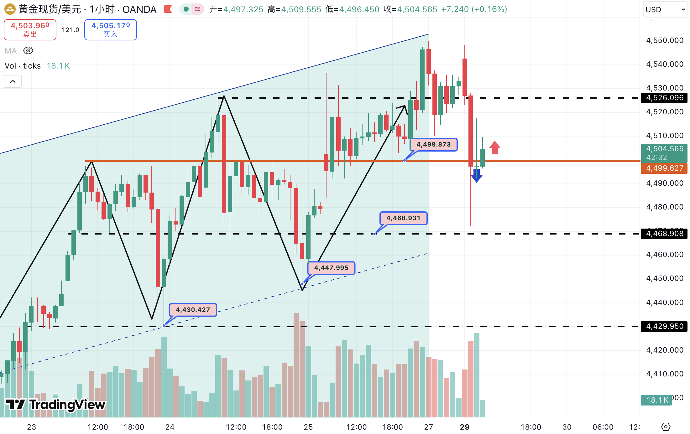 黄金今天开盘冲高回落,价格再次遇阻4550,最低打在30分钟183周期均线的4472反弹,该位也是我们上周多次强调的支撑位(见图1),该级别20周期均线所在压力位4520没有变化,成交量方面略有收敛,暗指当前的反弹力度可能有限。