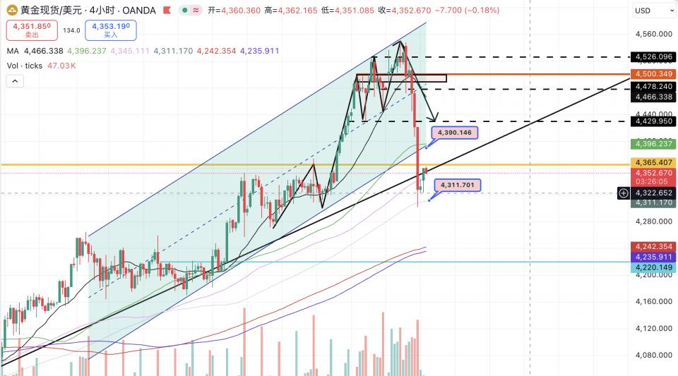 如果价格反弹触及这两个点位,可考虑继续短空操作,下方支撑参考4小时图120周期均线:4311美元和4301美元。一旦跌破4300大关,调整可能向4200美元延伸。
