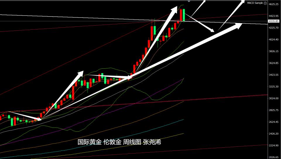 周线级别,金价本周遇阻回落转跌,相对于前周有形成阴包阳看空回落的预期,暗示后市将有继续走低触及10周均线4230美元乃至中轨及30周均线支撑位置4000美元关口附近或下方的预期,但如后市持稳于4300美元上方,则多头仍具看涨攀升动力,可继续布局多单入场。