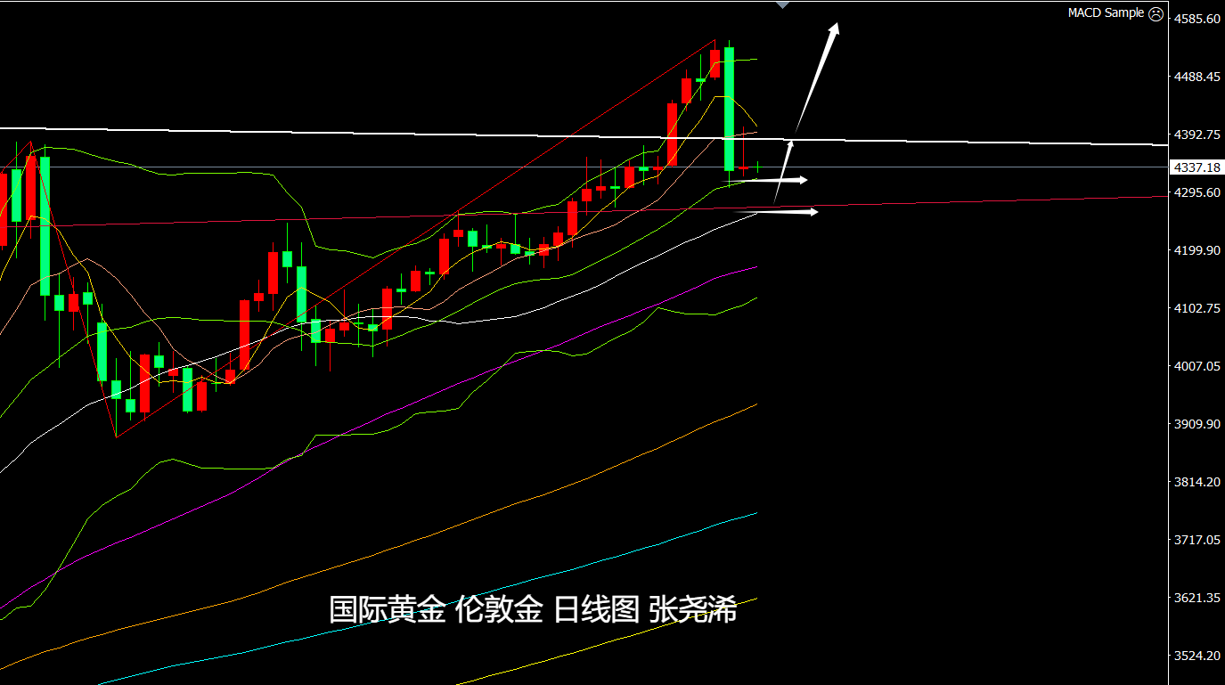 日图;金价昨日虽反弹遇阻,但也收取止跌看涨形态,中轨支撑仍未跌破,故此,在跌破此支撑前,仍可先行看涨,如进一步走低,下方30日均线4260美元或60日均线4175美元都是再度入场看涨的位置。