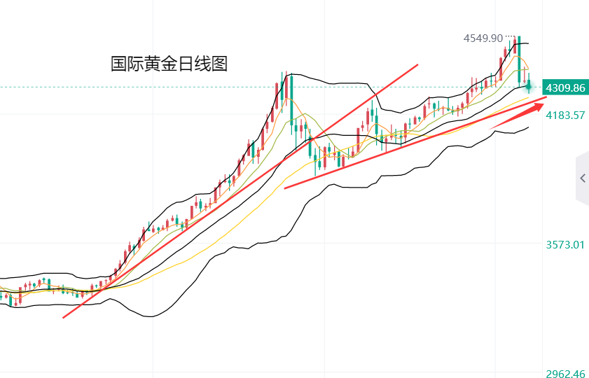 第一,黄金日线级别:下午针对上图做了一次调查,这周的一波下跌砸盘会循环走10月份中旬那波,还是11月中旬那波,基本上两者对半,选择概率都差不多;以我个人的判断来讲,结合图中所示,前期两波走势形态上都比较雷同,走完abc之后展开某一个底部区间整理,然后最终上破区间的上轨再单边发力上攻,而上轨其实指的是就是10均线;另外,紫色线代表中轨,两次都是击穿中轨才走完abc调整,无非就是c的力度有大小;而本周这次形态上如出一辙,也击穿了中轨,目前就是走最后c浪,也就是今晚或后续几日会产生一个底部区间,届时把握住此区间的相对低位,就是后市再次单边上攻的起涨点;因此,还是那句话,珍惜今年打压给出的低位;那么参考位置有哪些呢? 第一,是4275,这是昨日研报提及的50%分割支撑点,第二,4264-4251-4245都是前期顶底转换支撑点;第三,日线前期收敛三角下轨支撑点,今日对应下去是4227左右;第四,周线10均线,以及618分割支撑,对应4208-4205,属于强支撑;所以,个人认为,短期内的底部低点就在这四个支撑的其中一个;而判断正式成立出短期底部低点的形态就是哪天收阳于10均线之上,耐心等待,大牛市始终都在,2028前都很难改变;