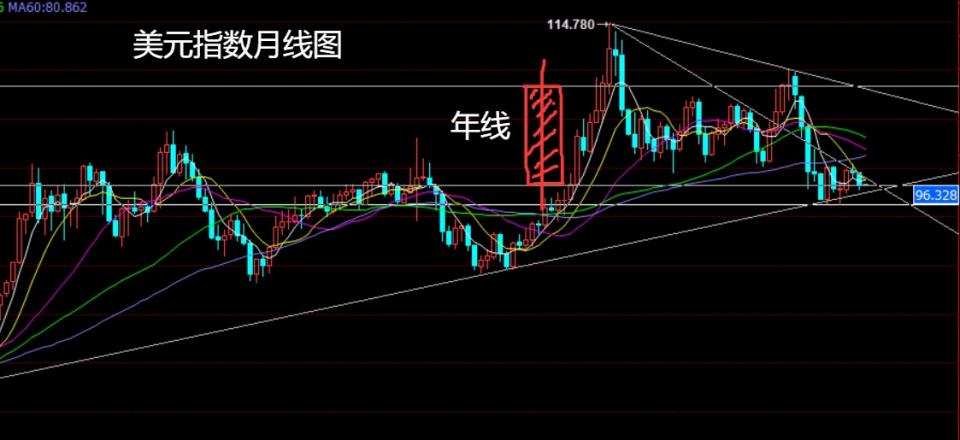 美元指数市场年初开盘在108.466的位置后行情先拉升,年线最高触及到了110.205的位置后旱情强势回落,年线最低给到了96.224的位置后整理,年线最终收线在了98.279的位置后,年线以一根上下影线基本等长的大阴线收线,而这样的形态收尾后,美指在2026年必破周期上行趋势线,目标剑指88.