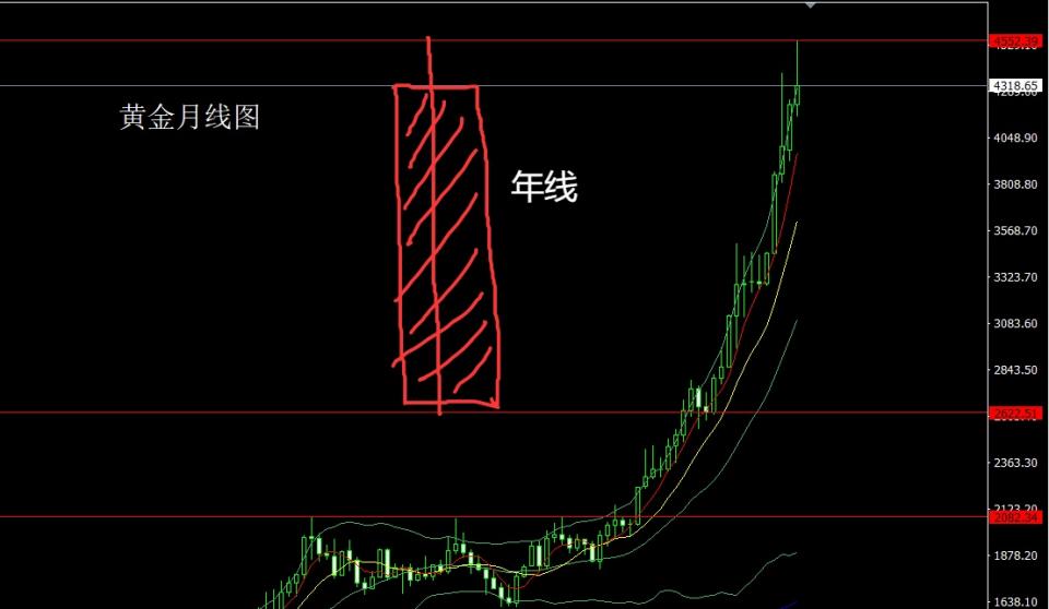 而月线上12月的初行情开盘在4219.7的位置后行情先回落,月线最低给到了4152.5的位置后,行情在避险和降息背景下强势拉升,月线最高触及到了4552.3的历史新高后尾盘获利了结回落,月线最终收线在了4318.6的位置后,月线以一根上影线极长的倒锤头形态收线,而这样的形态收尾后,1月的行情月初有回落压力,但给出低点4100附近后就是很好的趋势性多单进场机会。