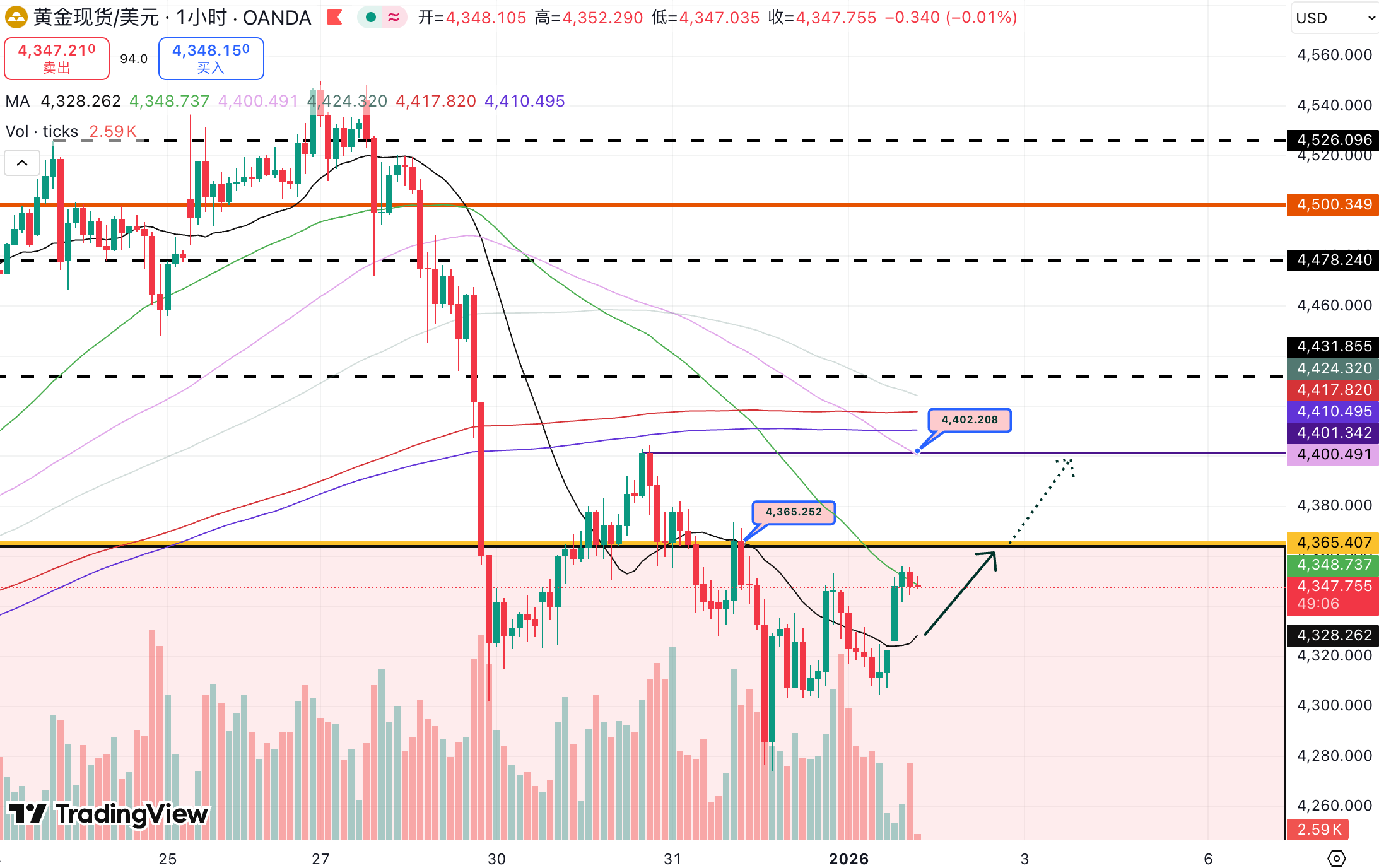 今天(2026年1月2日)是元旦后的第一个交易日,亚洲多数市场还在休息,黄金并不平静,早上金价高开高走,但还未触及我们前天划定的震荡区间顶部4365(图1),上方的压力位在1小时89周期均线的4404附近,短期支撑参考1小时20周期均线的4325。