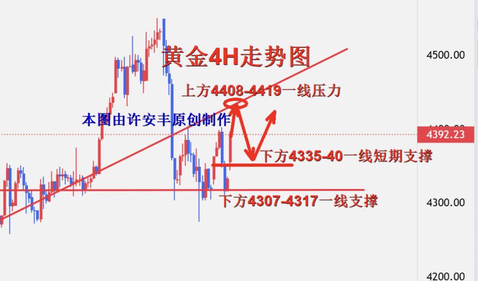 黄金周末因美委局势导致风险事件推高引发避险情绪,这使得我们看到了黄金早间的高开高走,但是能否延续才是关键。消息面往往会冲击价格,但很难改变趋势,日内冲高后走回落依然是大概率事件。再一个要注意的是,这次风险事件不具备持续性,不是持久战,对黄金短期避险的推动有效!今天开盘在4355一线,然后最低回踩触及4344一线反弹,最高已经到达4420一线,多头毫无疑问的强势,但是高位追多风险大,相反早间高开的缺口也是需要技术面填补,所以我们在4415-4423区间附近可以轻仓空一下,下方先看4435-4440一线的短期支撑位置,谨慎的朋友建议稳健把握,毕竟大趋势依旧是多头,我们回踩继续做多为主,今天周一的开盘走势已经验证了周末本人文章所分析的,开盘延续上涨的情况,而且也给了我们上方压制做空的位置。具体操作策略我会在盘中提示,及时关注。