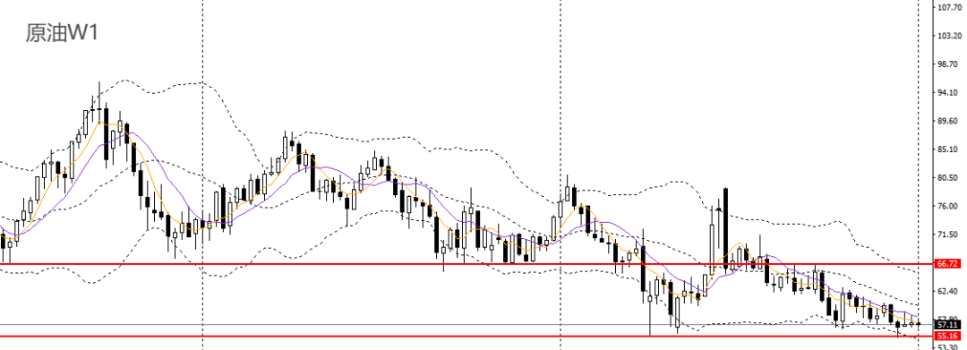 美原油上周再收十字星,承压于5周均线,RSI位于50下方,波段走势仍疲软。周五收十字星,仍徘徊于下行趋势线附近,4小时回踩56.50一线支撑企稳,但多头动能有限,如无法升破58.50一线阻力,多单建议暂时离场。
