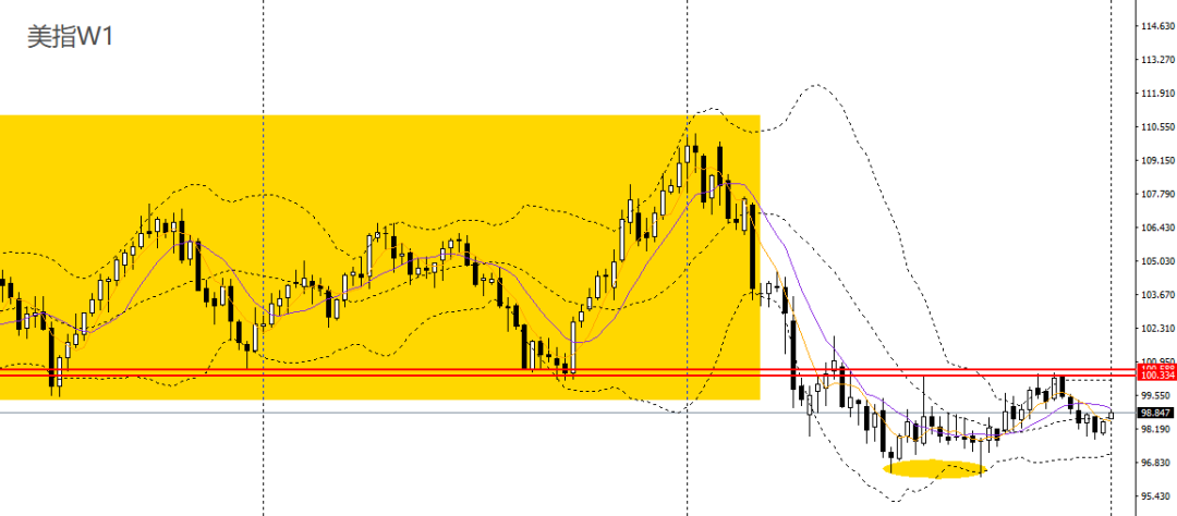 美元指数上周小幅回升,上探10周均线,RSI升至50附近,波段预计将延续震荡格局。周五收看涨吞没阳线,上破日线布林中轨,4小时升破关键压力98.70,如维稳于上方,后市有望反弹至99关口。