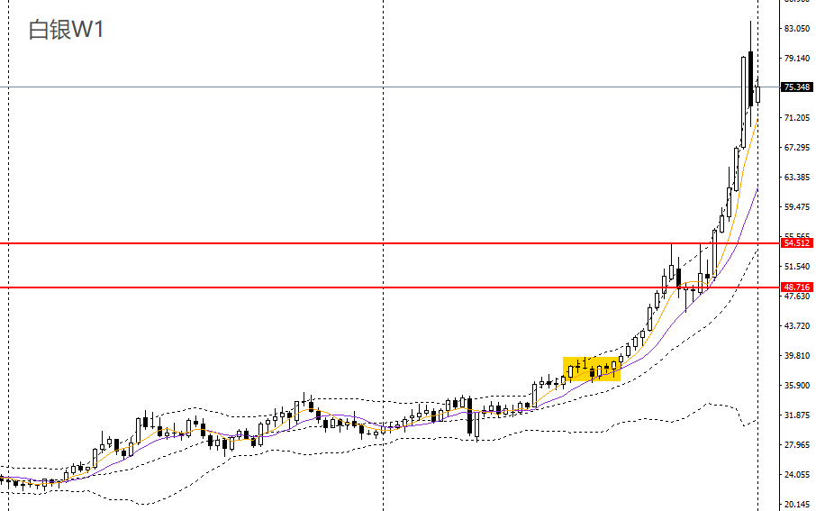 白银上周再度升破前高,徘徊于周线布林上轨附近,RSI位于超买区附近,波段预计将延续涨势。周五收十字阳线,仍立于10日均线之上,4小时仍处于区间震荡格局,如回踩70-71一带企稳可进多。
