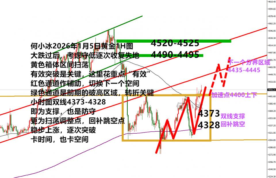 然后元旦假期前,周线开盘即高点直接4550跳水,就周一跌幅就将近250美元,后面几天的走法都是偏扫荡调整了,周二先大涨80多美元,然后午夜尽数跌回,周三再跌破低近100美元,然后又探底回升,跌多少涨回多少