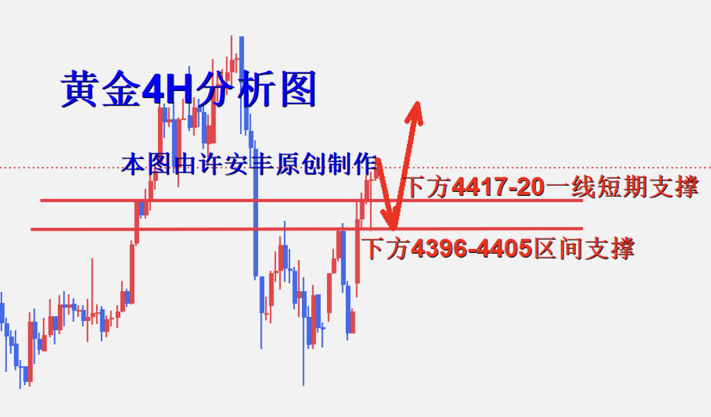 黄金凌晨继续冲高,最高触及4460一线,多头强势不可阻挡,下方短期线关注4417-4420一线短期支撑,今天重点关注4396-4405一线的支撑情况,回踩不破我们继续主多,上方先看4466-77区间的短期压力,黄金多头有望继续强势突破新高,昨天黄金美盘最低回踩4396附近就开始继续上涨,今天继续回踩做多,切勿高位追多,否则面临回踩风险。