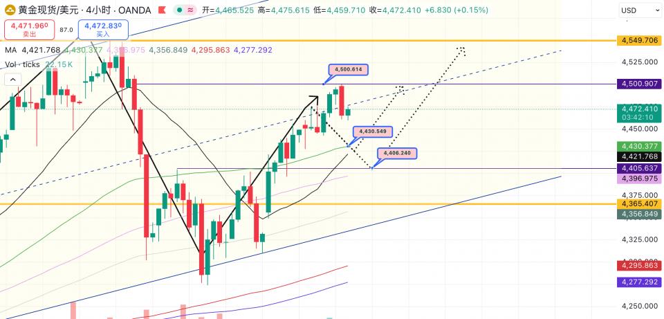 正如偶们昨晚的预期,金价在触及4500(第二做空点,如图)后开始大幅回调,今天早盘价格快速跌破4485,从1小时线的放量程度来看,价格很有可能再度向下方试探,我们先关注4455-50的支撑区域。