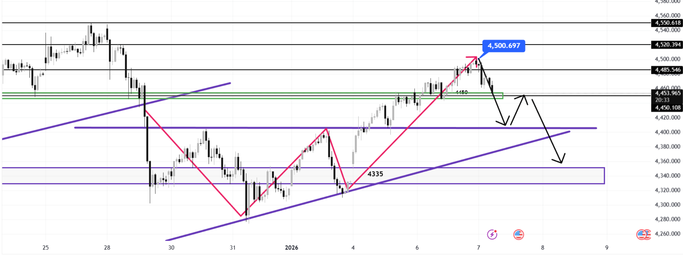 今天市场焦点集中在 美国ADP就业数据。在数据公布前,我对黄金的短期趋势判断偏向下行,整体仍处在回调结构中。从盘面来看,日内低点已下探至4450附近。