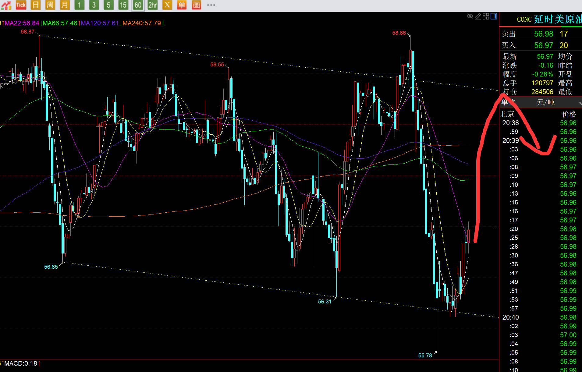 原油方面:昨日研报指出,靠近59、59.5去陆续看压制下行,日内最高58.85,差一点,最终是符合预判,成功打压一波;当前处于图中黄色通道内运行,下轨有所稳定,预计有望逐步反弹去靠拢上轨,支撑56一线,阻力58.3;