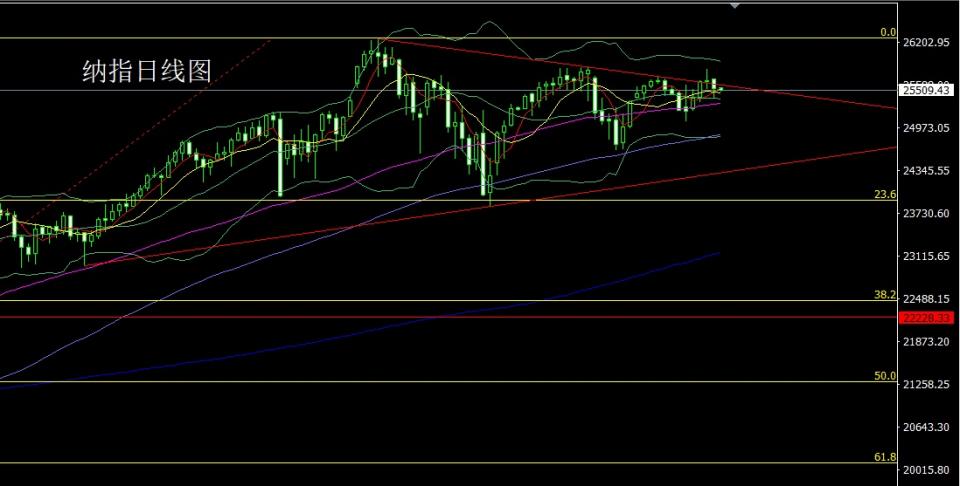 纳指市场昨日开盘在2669.83的位置后行情直接回落,日线最低给到了25390.42的位置后行情收到日线级别布林中轨支撑反弹,日线最终收线在了25538.12的位置后,日线以一根下影线很长的中阴线收线,而这样的形态收尾后,今日的行情先回落25420多止损25360,目标看25530和25600和25670.