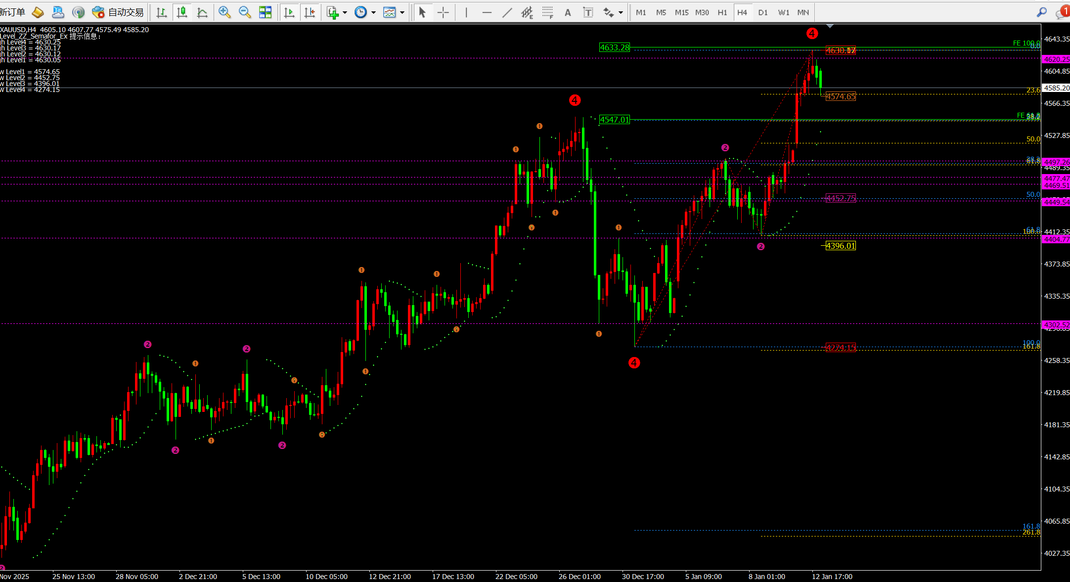 根据日线的斐波拉契扩展线看目前上方压制在4653-4683一线,支撑4577-4547-4508以及4435一线。