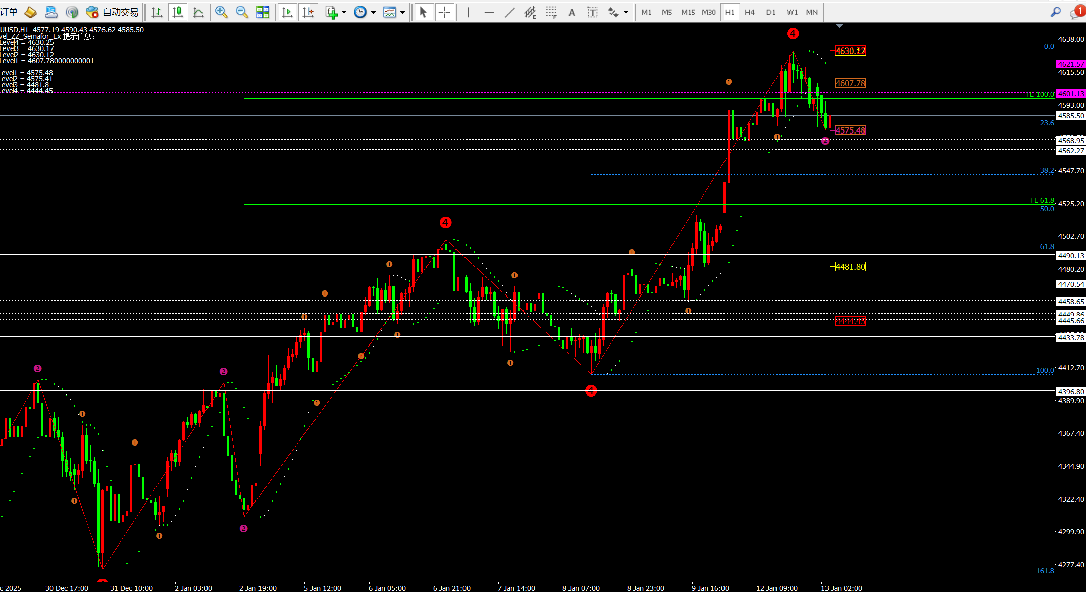 昨日开盘价格跳空高开高走至4601一线回落到44562一线;之后价格低位4562-4582区间震荡后再次冲高4598一线回落4580附近再次冲高并破位4601到达4620一线,之后价格快速探底4585附近后再次拉伸至日内新高4630一线震荡回落4589一线并最终收盘4597附近。