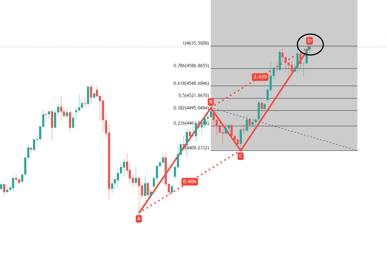 在我的交易经验中,这行情是不能提前看跌的,早上直播很多人问要不要提前进,看似可以把防守放在前高30,但其实这跟市场送钱没什么区别,想要做这种高位调整惯性交易,那价格就必须要高,怎么才算高?那肯定要跟前高对标才行,更别说这里还是一个衡量高位压力了,我图里的两阶段上涨,包括ABCD的终点也都在4635,那不好意思,这里就是我今天的看跌位,现在已经进场,不算健康,跌了几美金而已,防守就直接锁在高点4650,我的目标很简单,不要求什么大跌特跌,只需要到位4600就跑路,这三十几美金已经够我用了。