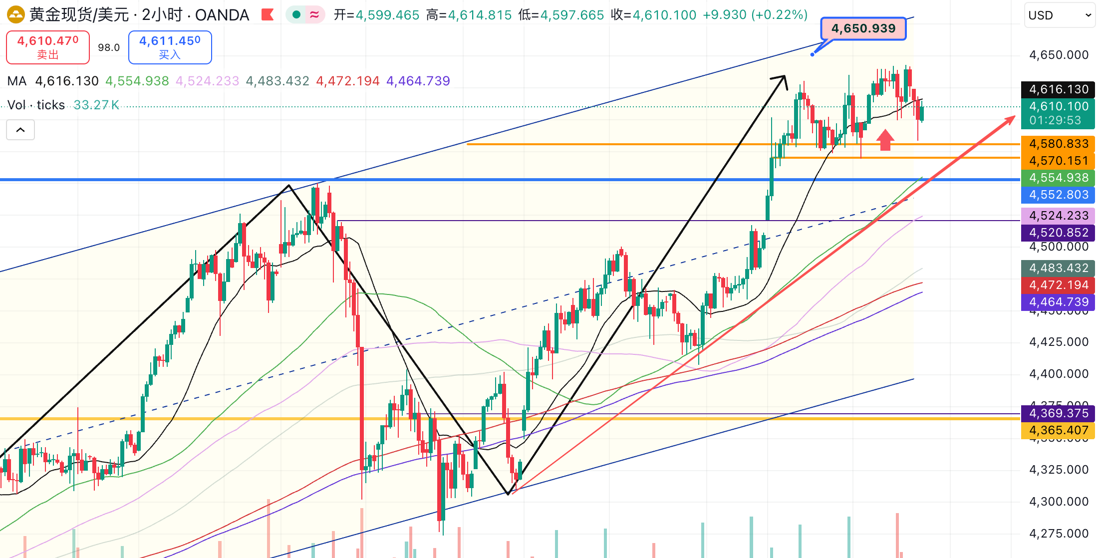 操作上高空单交易者可以继续在4655附近布局,这里是4小时布林带上轨压力,并且从4小时级别的负面指标走向来看,金价直线触及4650的可能性不大。