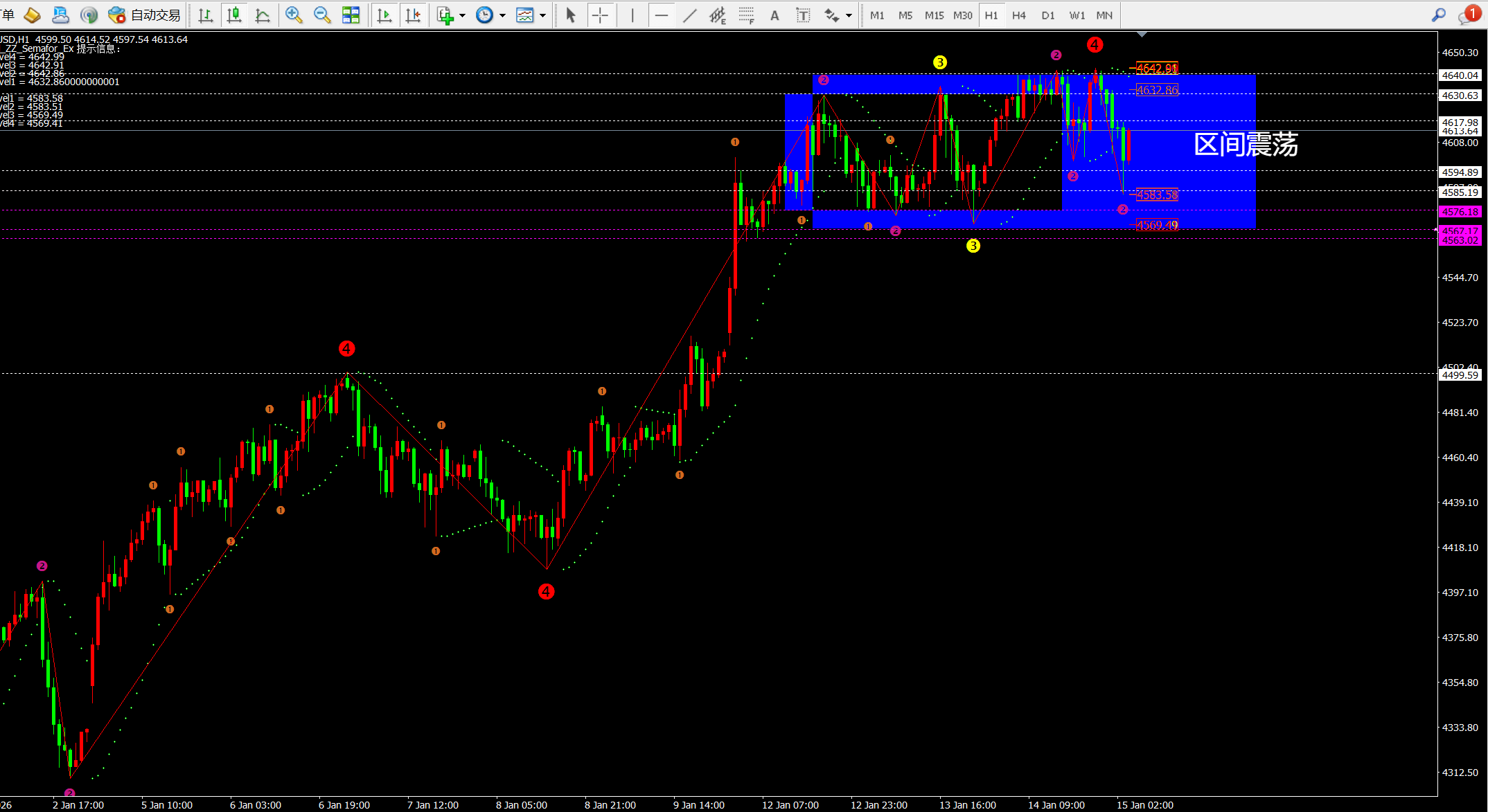 那么结合日线和4小时就得出了区间操作4640-4570.当然这些点位都是最佳点位,可以适当提前布局,也就是空可以在4627-32;多可以在4578-82;