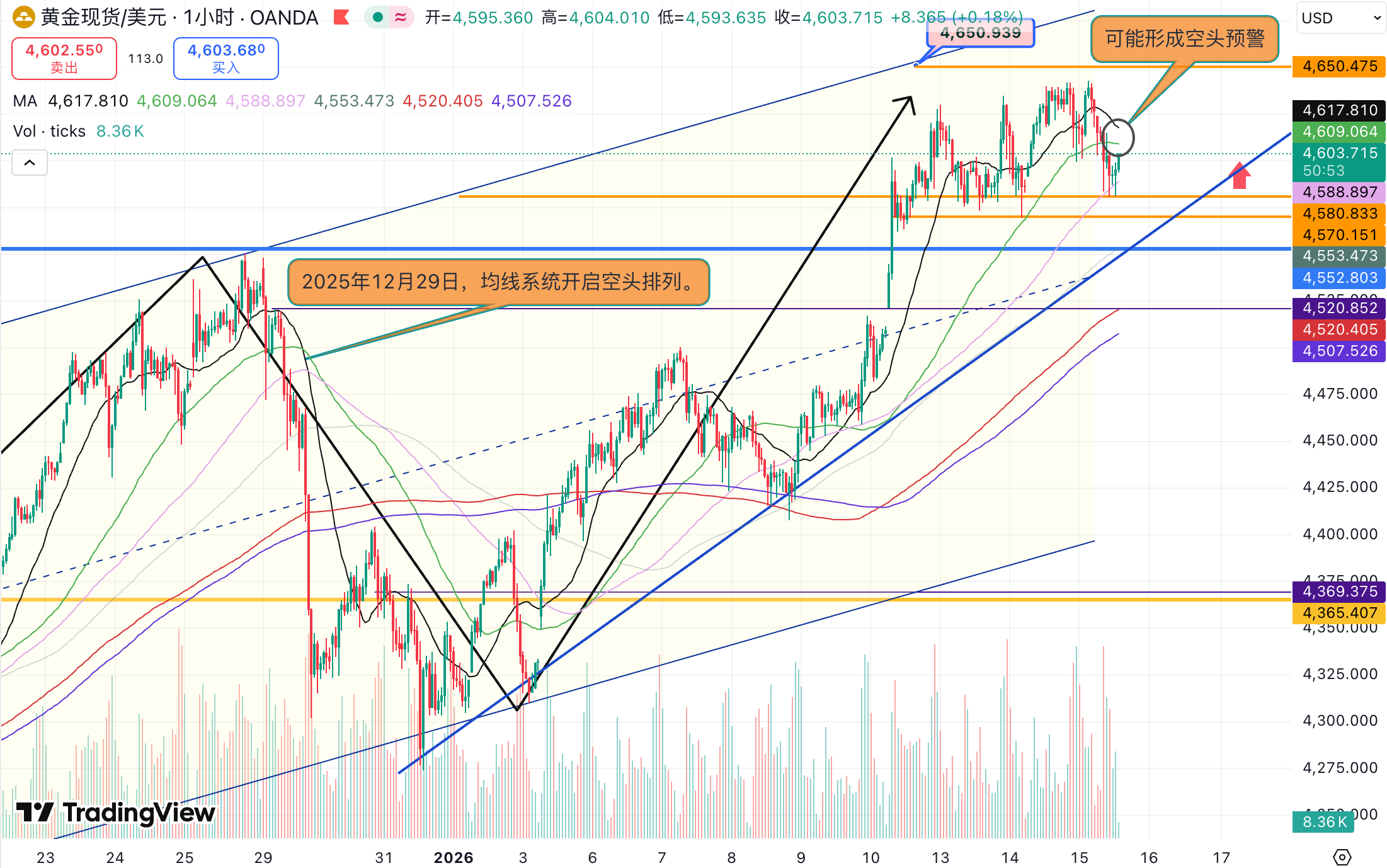 当然追跌我是自愿的,因为只要破位4570,那就代表行情会进一步扩大跌幅,到时候就极有可能触发我所讲的黑色交易日,去看下方4500的预期目标,即便进场后会有短期反弹,我会根据不同的情况做持仓调整,比如加码等操作,这不建议各位跟从,只是在这给你们分享下我的交易思路而已,但愿今天平安,那我也不用去抓这种行情,能上去的话,我就继续秉承高位4650的看跌交易姿态不变。