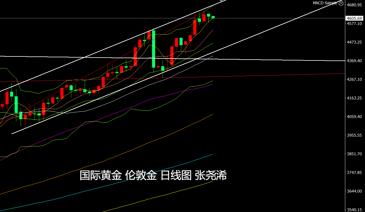 日图;金价近日多头动力有所减弱,维持在高位震荡盘整,短期来看,有震荡调整至10日均线4545美元附近,以及中轨线4475美元附近的预期,但由于近几个月整体的回升趋势良好,故此,如有回撤触及此等支撑,也是看涨入场的机会。反之如反弹走强突破震荡格局持稳收阳,则顺势跟进看涨。