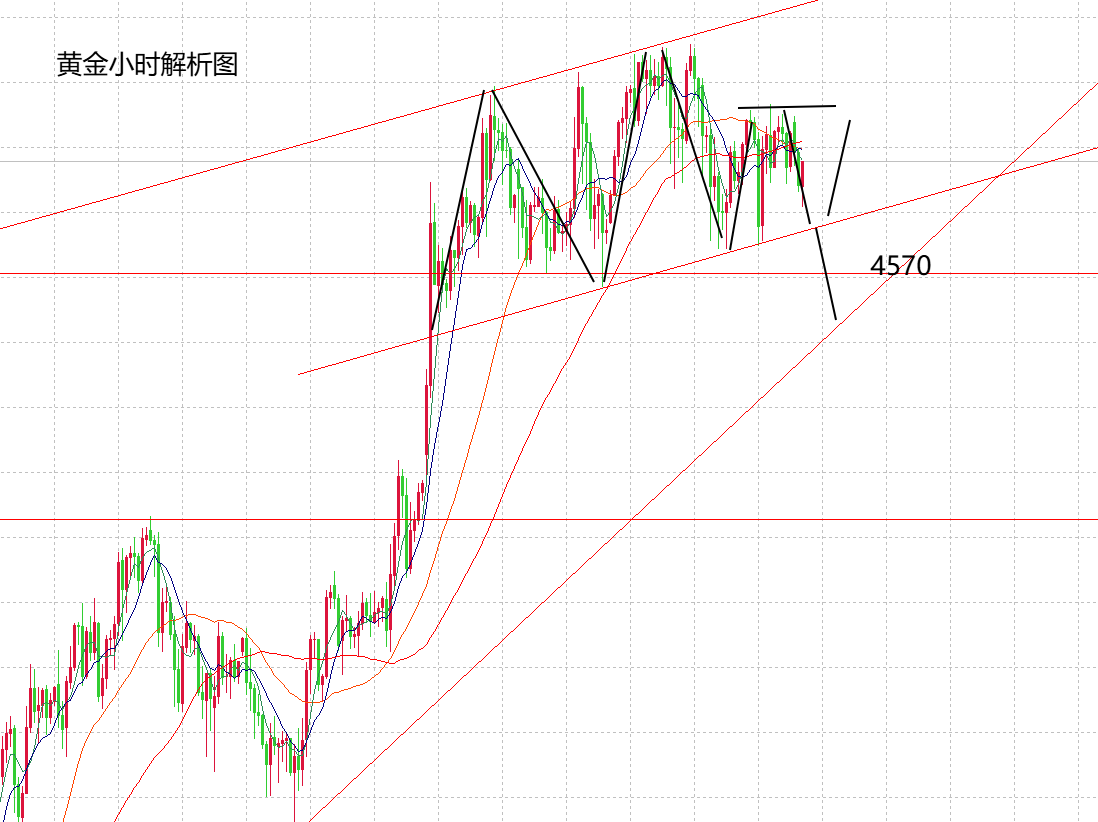 老规矩,先看图,图形比较明显,本周经过四个交易日的变化,现在黄金在技术图形上的表现有两个形态,第一个是小周期性的上涨通道,前期的高点4630,3643形成上涨趋势通道的上限,下方4570,4580形成上涨通道的下限,只要这个通道没有破位,还有可能会继续在通道中延续上涨,所以,暂时还是维持4640/4670小区间中上涨,第二个前期高点4550,4640形成的趋势线,以及4720和4405形成的趋势线,连在一起形成了上涨趋势中的三角震荡形态,并且越往后走,三角区间越小,有破位的可能性,需要重点关注这个周期的变化。另外还要注意,在本周三天的震荡中,低点4580已经三次试探,形成非常强势的支撑点,这个价位不破,黄金也很难走出下跌的延续,更不用说大跌空间,其实,技术面的重点在4570,也就是近期一直强调的强弱关键点,破位后必有一波下跌,可以去4520甚至更低,没有破位就是强势。所以,综合来看,黄金还是多头趋势,还是强势,下方支撑4580/4570支撑带,上方暂时4640压制,只要趋势不变就不猜顶。大胆预测,小心求证,日线已经破位5日均线,可能去10日均线,今天日线收阴的话,破位4570支撑会去4520,日线收阳的话,破位上方压制会去4680,如果是震荡走势,就看H4周期的上下轨通道4640/4570!