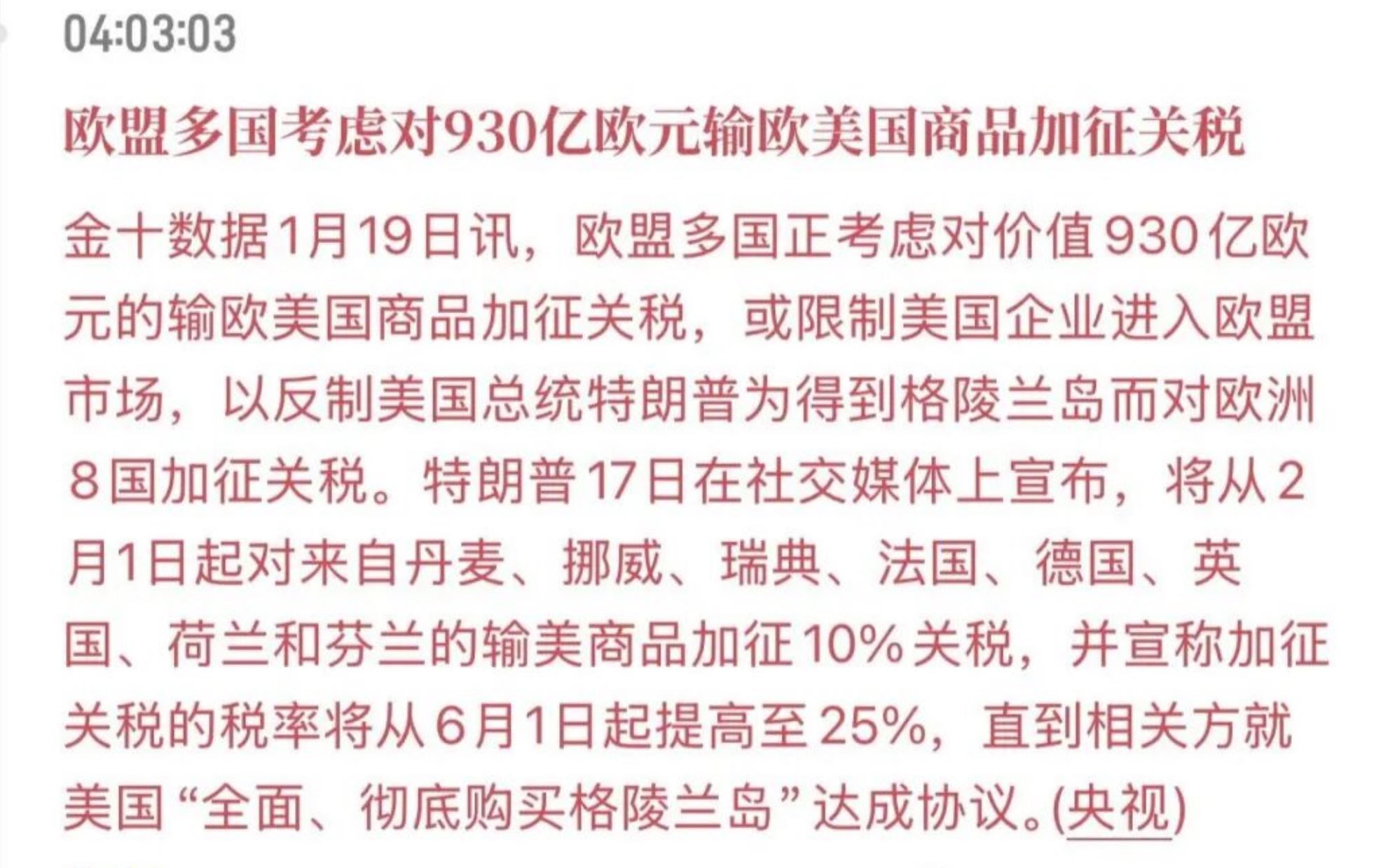 川普是王八吃秤砣铁了心要拿下格陵兰岛,丹麦和欧洲不会屈服;这不仅仅是一个岛屿,是领土,是资源,更是脸面。特朗普在去年中东之行从沙特和卡塔尔拿到近2万亿美元投资,关税大棒后不少国家屈服后,今年又抓走委内瑞拉总统,简直是信心爆棚。