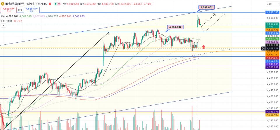 新的地缘威胁显著增加了投资者对避险黄金等资产的偏好,今天的高开直接将金价提高到4650上方,我们早上的多单亦在此基础上进场(下图)。