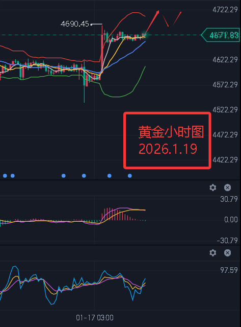 现货黄金(伦敦金):技术面上来看上周五日线收了一根小阴柱,布林带开口,KDJ指标继续放量,MACD快线处于慢线上方且红色能量柱继续发散,目前来看大趋势仍旧偏上,中线阶段性上行,这也是我们这段时间一直坚持的思路。短线4小时图中来看,布林带开口,KDJ指标金叉放量,MACD快线处于慢线上方且红色能量柱逐渐发散。小时图中来看,布林带缩口 ,价格即将选择新的方向,KDJ指标死叉放量,MACD形成死叉。短线价格如期反弹,目前短线先关注反弹的情况,下方支撑关注4653/4640/4620一线,上方压力关注4678/4690/4722一线。另外,马丁路德金纪念日假期部分产品提前休市,朋友们注意做好风险控制。