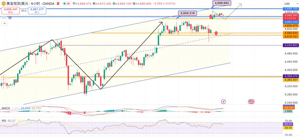 黄金:下方关注4650美元或4630/4580美元附近支撑;上方关注4700美元或4725美元附近阻力;