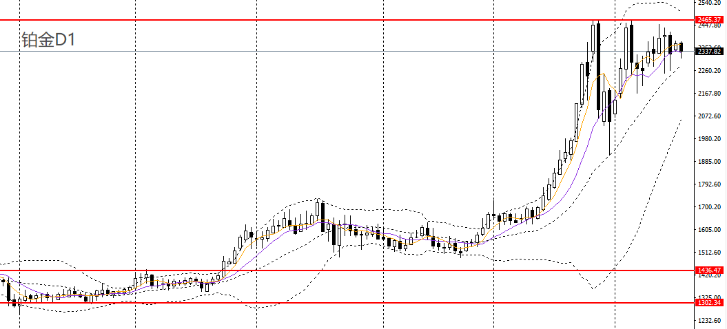 铂金收小阳线,徘徊于5日、10日均线附近,日线呈三角整理,多头动能减弱,短线延续高位整理的概率较高,可保持观望。