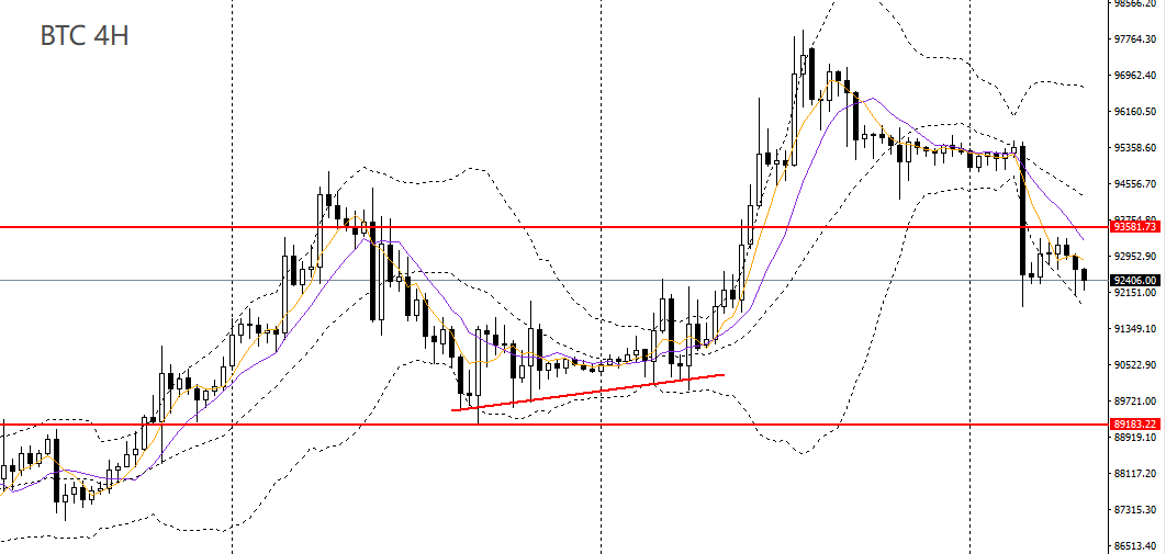 比特币收长阴柱,失守10日均线,日线RSI跌至50左右,94000再度成为上方强压,如无法升破,短线预计将重新回踩90000附近。