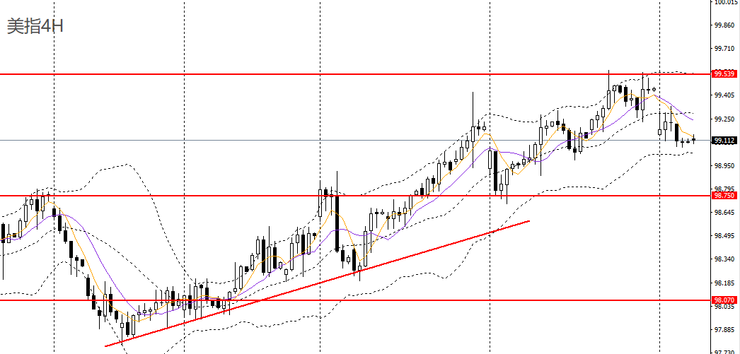美元指数收十字阴线,回踩10日均线,日线RSI延续回落,4小时回踩99关口,如彻底跌破,短线预计将下探98.70附近。