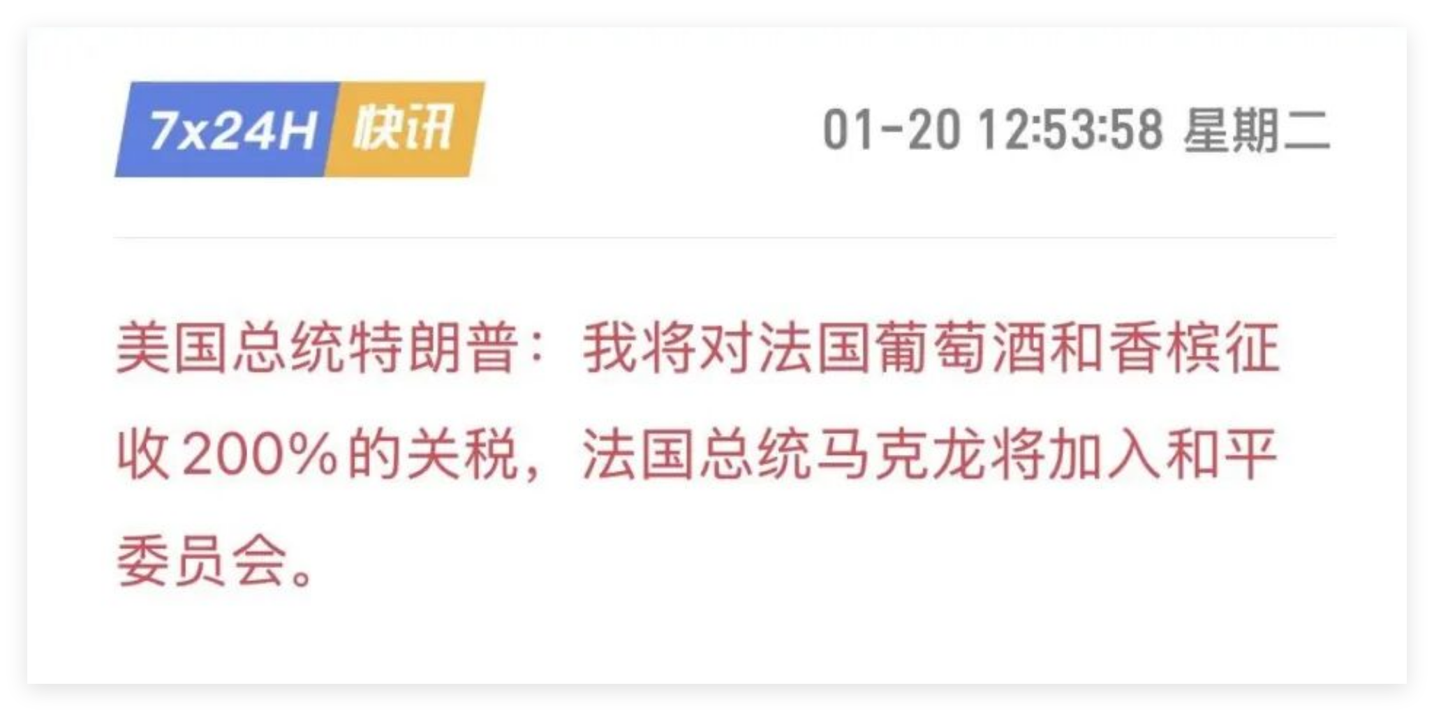 据最新消息,美国总统特朗普:我将对法国葡萄酒和香槟征收200%的关税,法国总统马克龙将加入和平委员会。