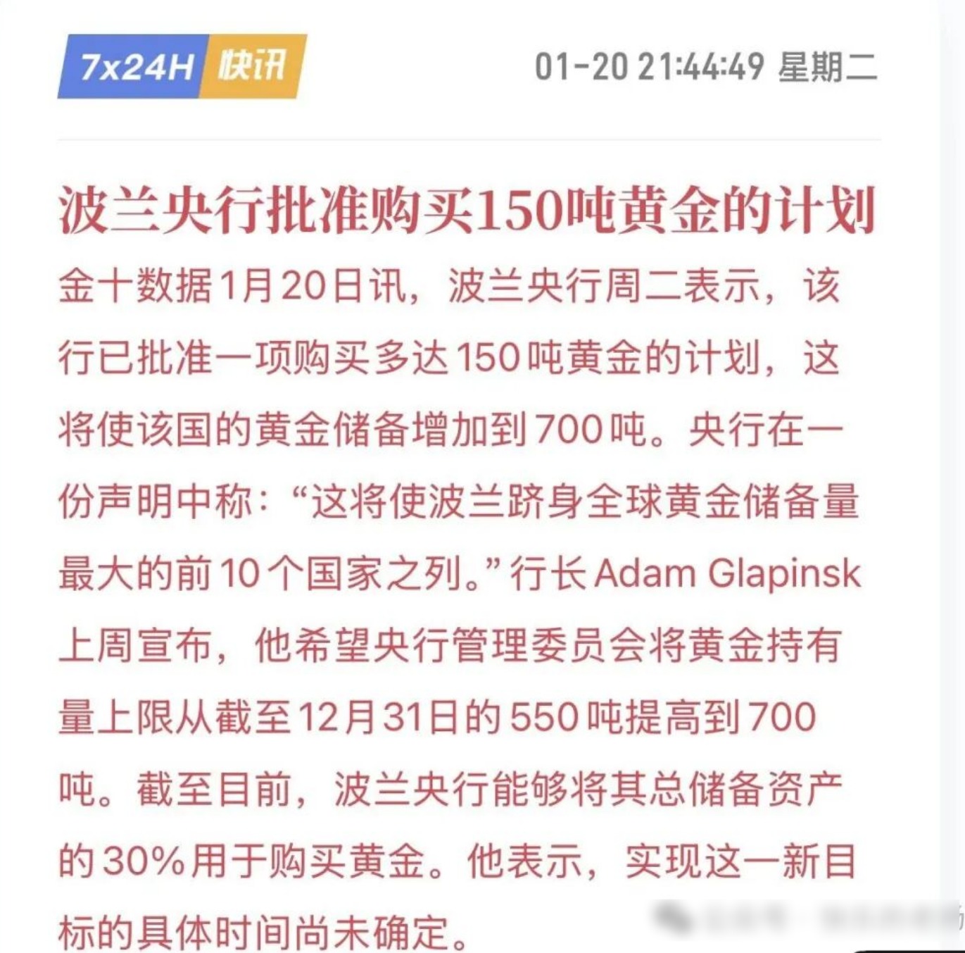 波兰央行批准150吨黄金购买计划,要知道我国央行2022年至今,增加的黄金储备量也不过300来吨。