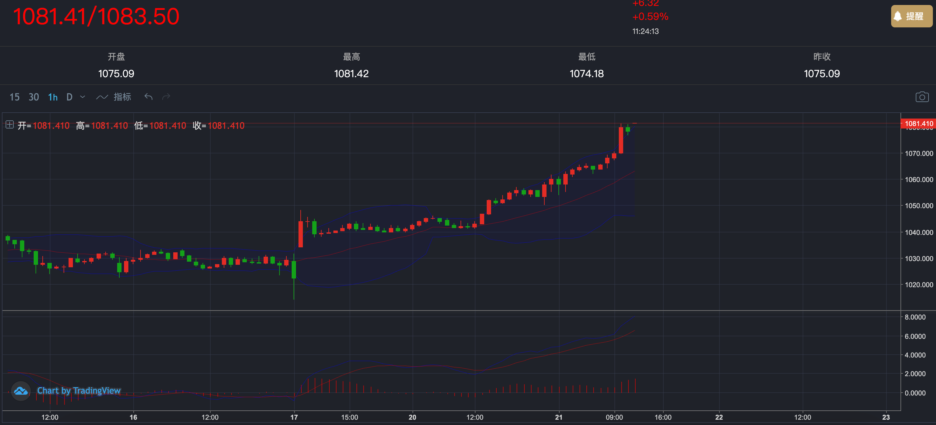 今日融通金开盘1075.09,高触1081.42,从1小时线看:早盘突然放量拉升,一根大阳线直接突破1080关口,成交量柱子激增,显示多头资金强势进场。