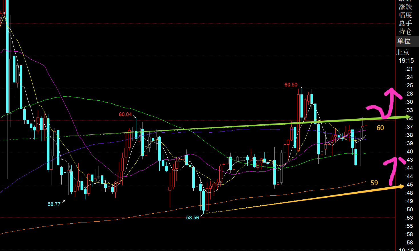 原油方面:从上图看,今晚留意两个位置,一个是59支撑,此位置上继续北上反弹,或者站稳了60关口后,回踩确认不破也是北上机会,阻力目标63;