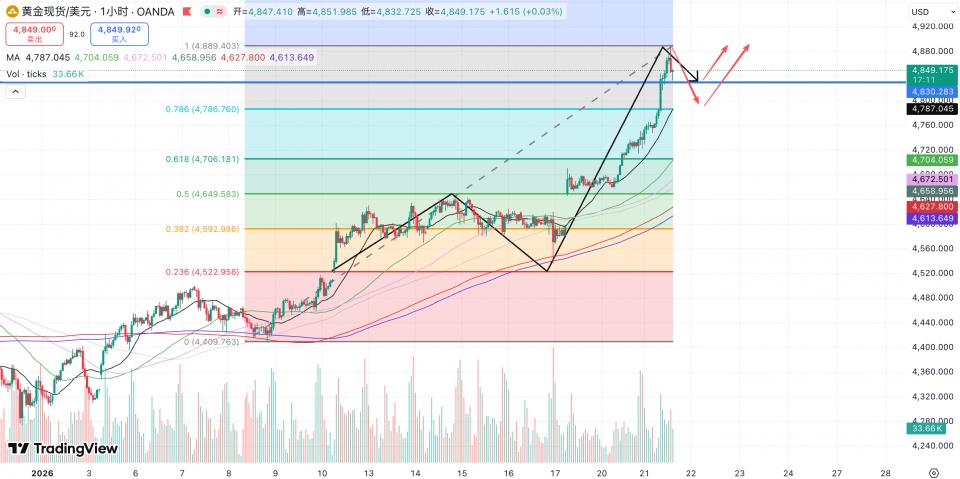 从之后的走势看,周三亚盘开盘后,黄金小幅回落至4657美元后,很快企稳突破4766美元,继续刷新历史高位,最高涨至4888美元,逼近4900美元整数位置,遇阻后黄金回落4832美元企稳,美盘开盘时反弹4880美元遇阻,此后黄金震荡回落,盘中一度跳水急跌近100美元,最低跌至4756美元,回吐日内全部涨幅,不过金价很快企稳反抽,收盘前重回4800美元上方。总体来看,黄金再创历史新高,比我们的看涨预期表现更加强势。
