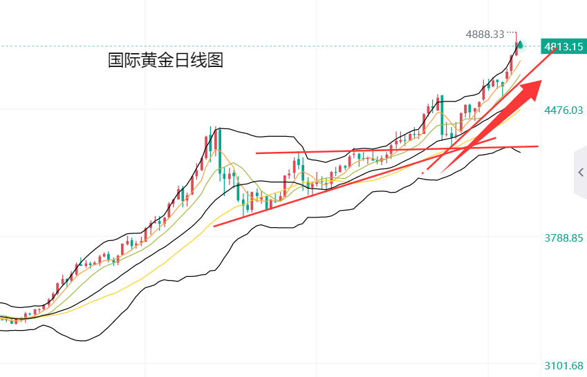 具体走势上,金价自亚市开于4764.09美元/盎司,先行走强,于9点时段突破4800美元关口,并连续反弹至14点时段触及日内高点4887.76美元并遇阻,欧盘时段再度横盘整理,美盘时段持续回落走低,于盘尾时段,一度跳水转跌,录得日内低点4755.84美元,最终反弹回升再度走强,收于4830.99美元,日振幅131.92美元,收涨66.9美元,涨幅1.4%。