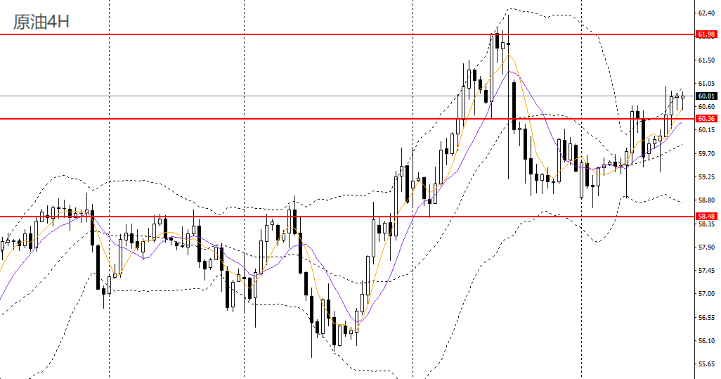 美原油周三收长阳柱,站上5日均线,4小时站稳59附近支撑,且站上60.30一线关键阻力,上行空间打开,多单仍可持有,短线可继续看多至61,61.50。