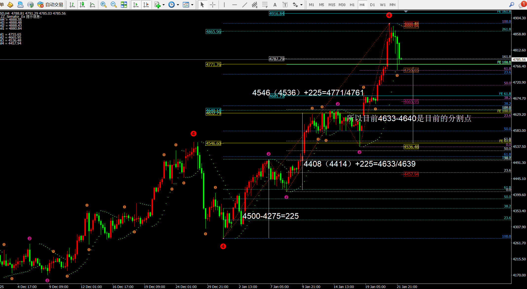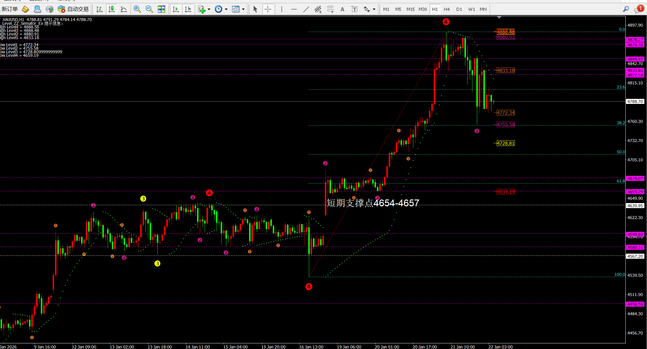 如果价格高位震荡且没跌破昨日低点,那么今日高点就还没出现,短期4833会进行破位的。参与多单的点位在4772-4765区间最佳。