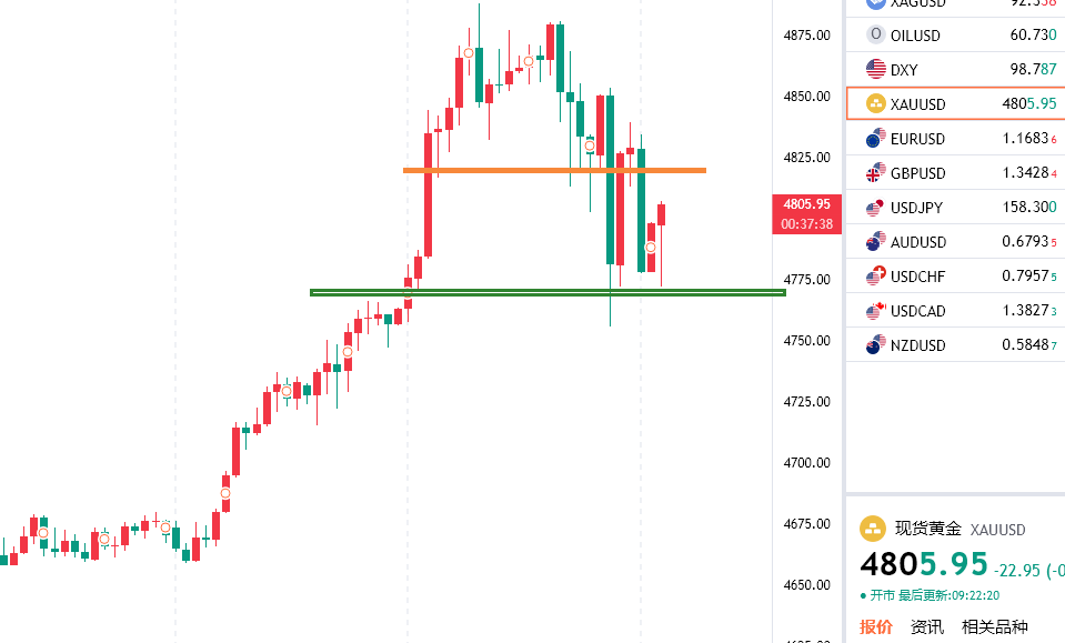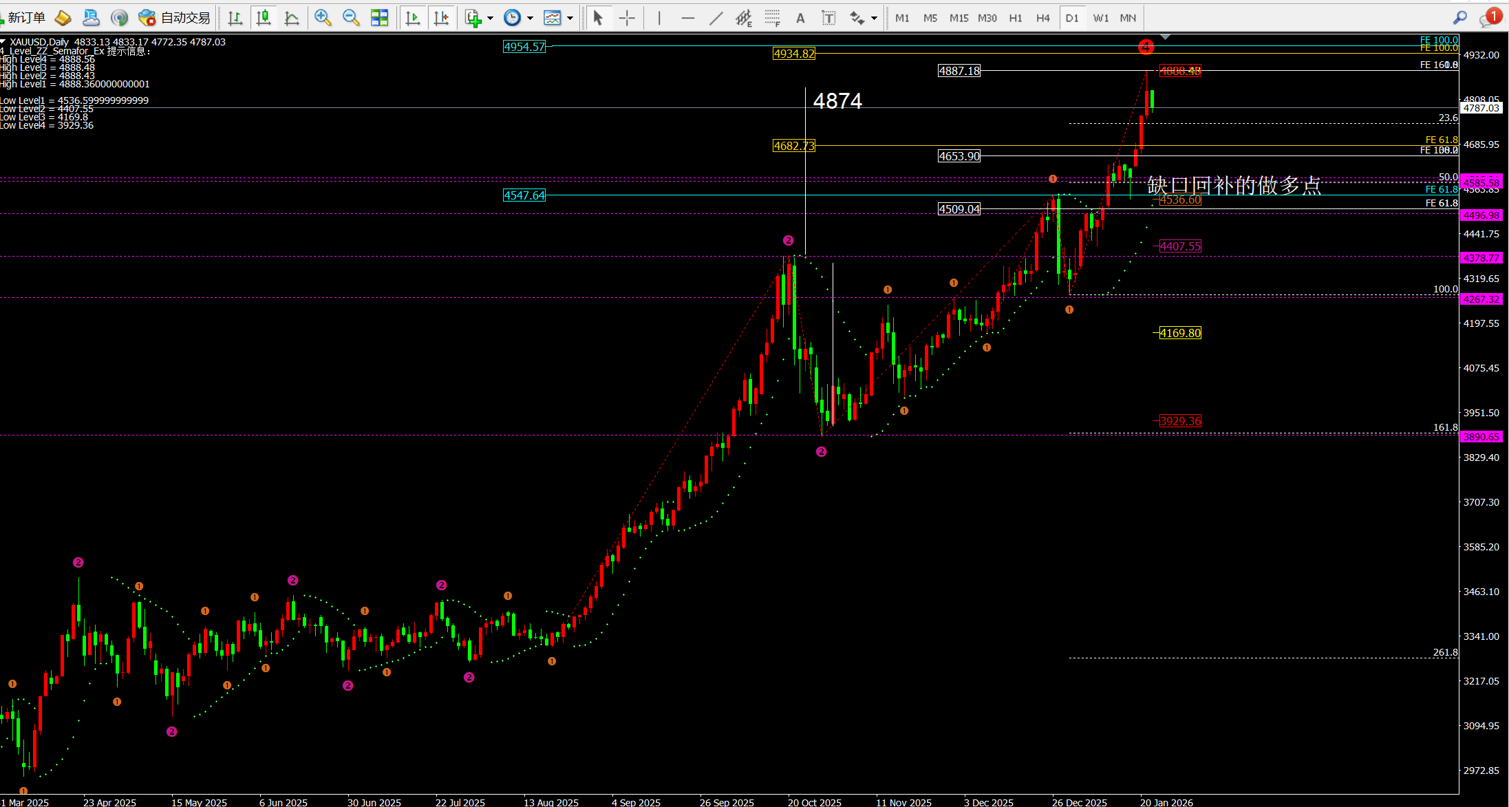 黄金最高到了4888,昨天尾巴行情出现了的回吐,最低跌到了4755附近,最终日线还是收阳,没有一直涨的行情,涨的越多修复的空间就越大,之前我们一直在布局多单,今天开始我们空单也要上了,把握好节奏才是最重要的,黄金短期出现了疲软调整还没有到位,目前看4755还不是这波调整的低点,老古预估后面的调整还是会破4700这个位置,调整幅度可能是在200个点区间,今天的黄金我们先看看4831这个位置,价格在4831下面都是看调整,注意调整也只是调整,长期趋势还是多头,4888不是这波大涨的高点,后期还是有继续杀高的可能性。