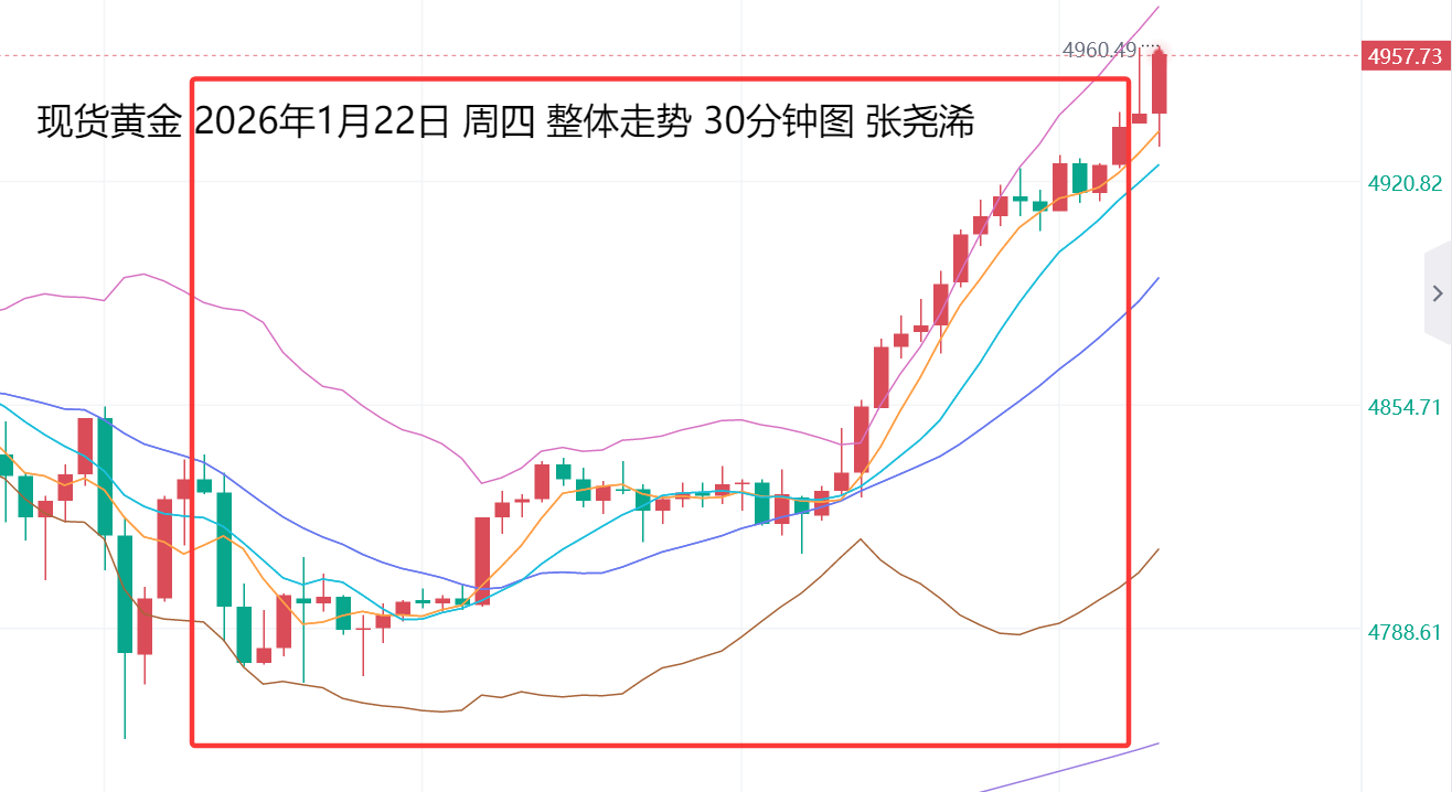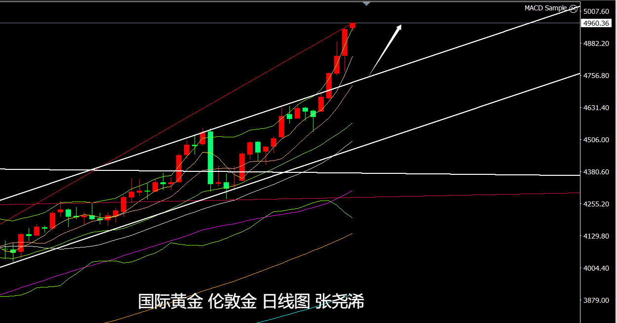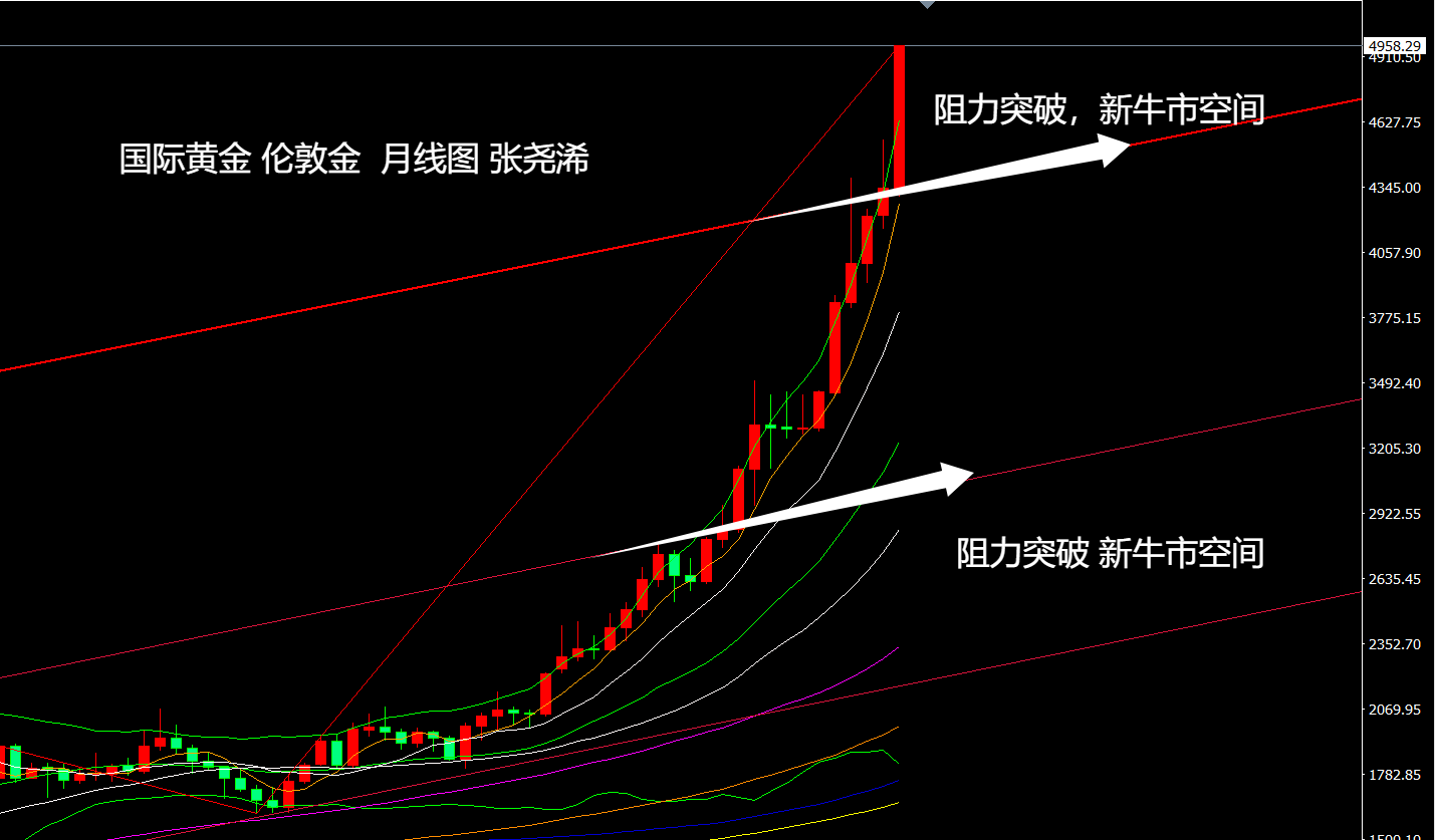 上交易日周四(1月22日):国际黄金短暂回调后,再度反弹拉升,刷新历史高点,并持稳收阳,稳于本周突破趋势线压力后的动力,这暗示后市看涨前景加大,新的牛市空间已经打开,后市将迈向更高位置和难以想象的高点。