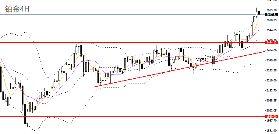 铂金收长阳柱,日线呈空中加油,今日继续升破前高,如回踩2600附近企稳可进多,后市大概率将进一步上探2700。