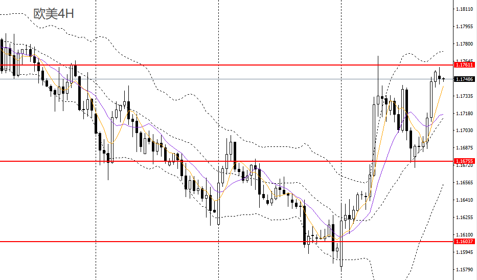 欧美日线呈多方炮,站上5日均线,日线RSI位于50上方,4小时守住1.1670附近支撑,且逼近1.1760附近阻力,多单仍可持有,如进一步升破,可看多至1.18。