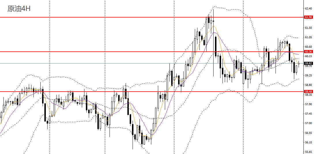美原油昨日涨势暂歇,徘徊于5日、10日均线附近,4小时于61关口附近遇阻回落,短线重归震荡格局,稳健者可暂时观望。